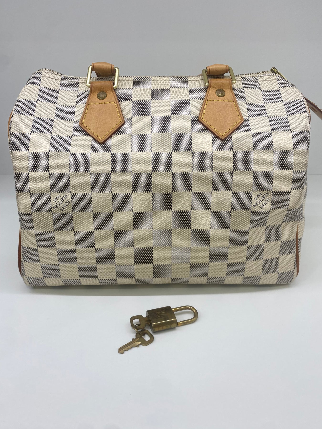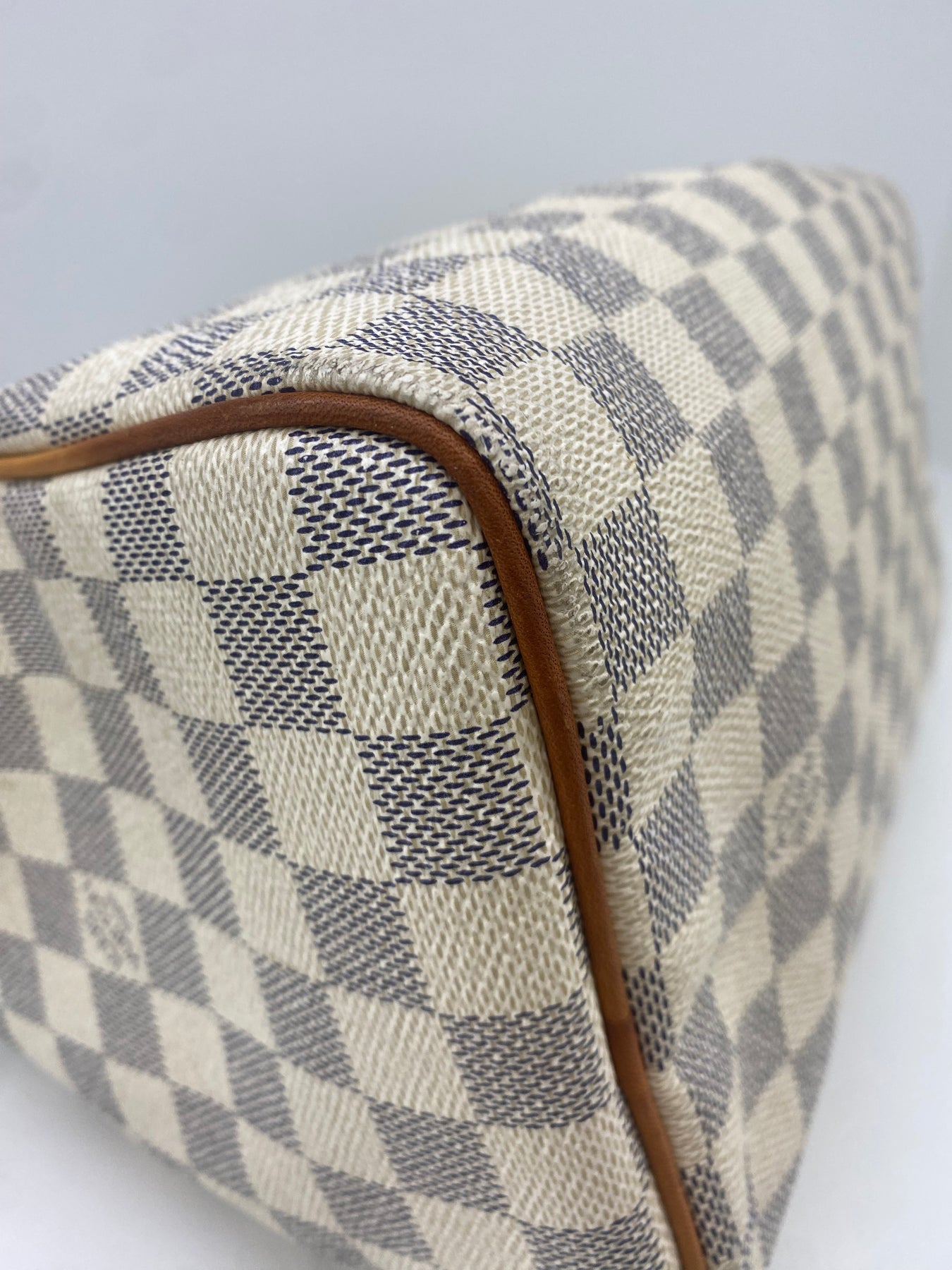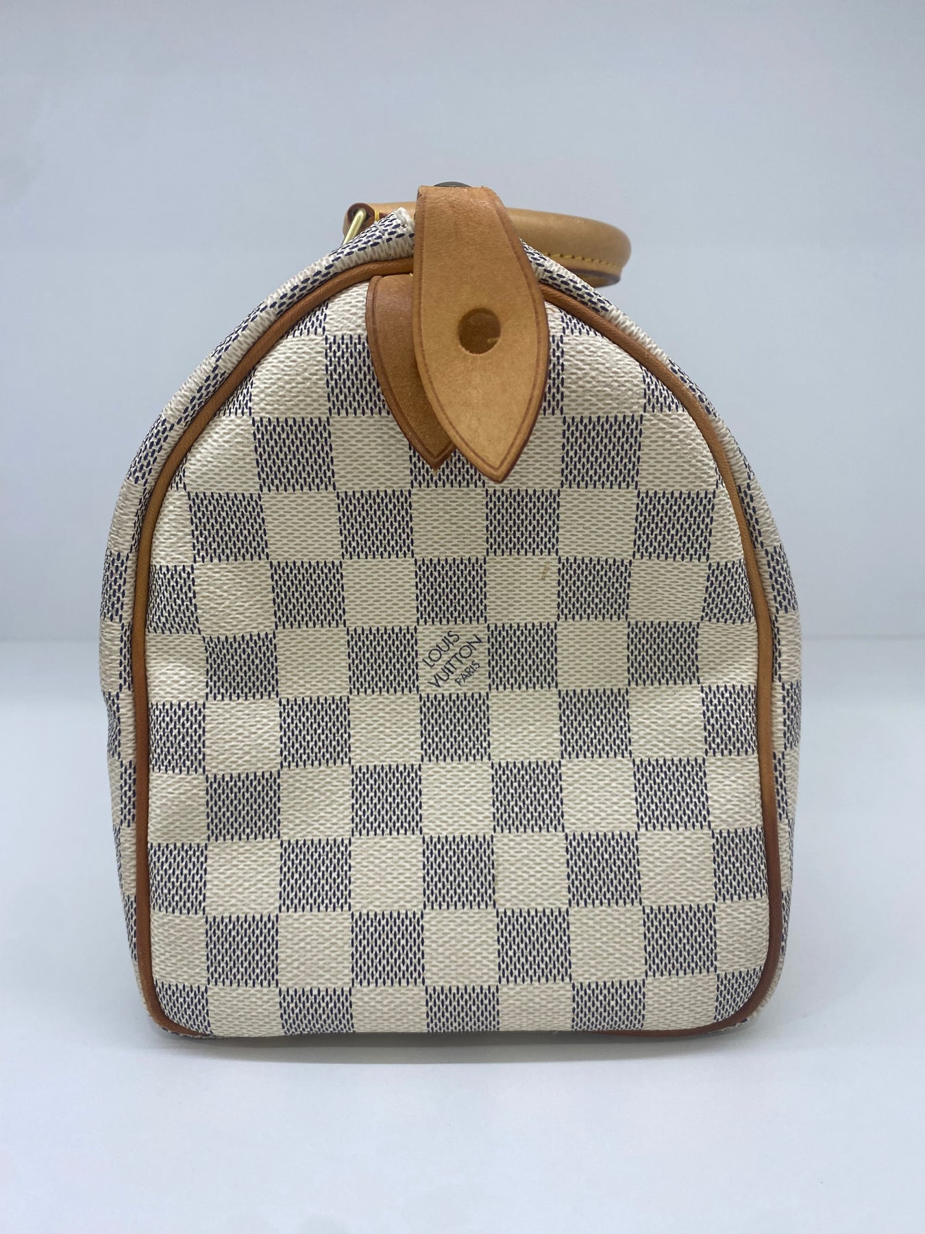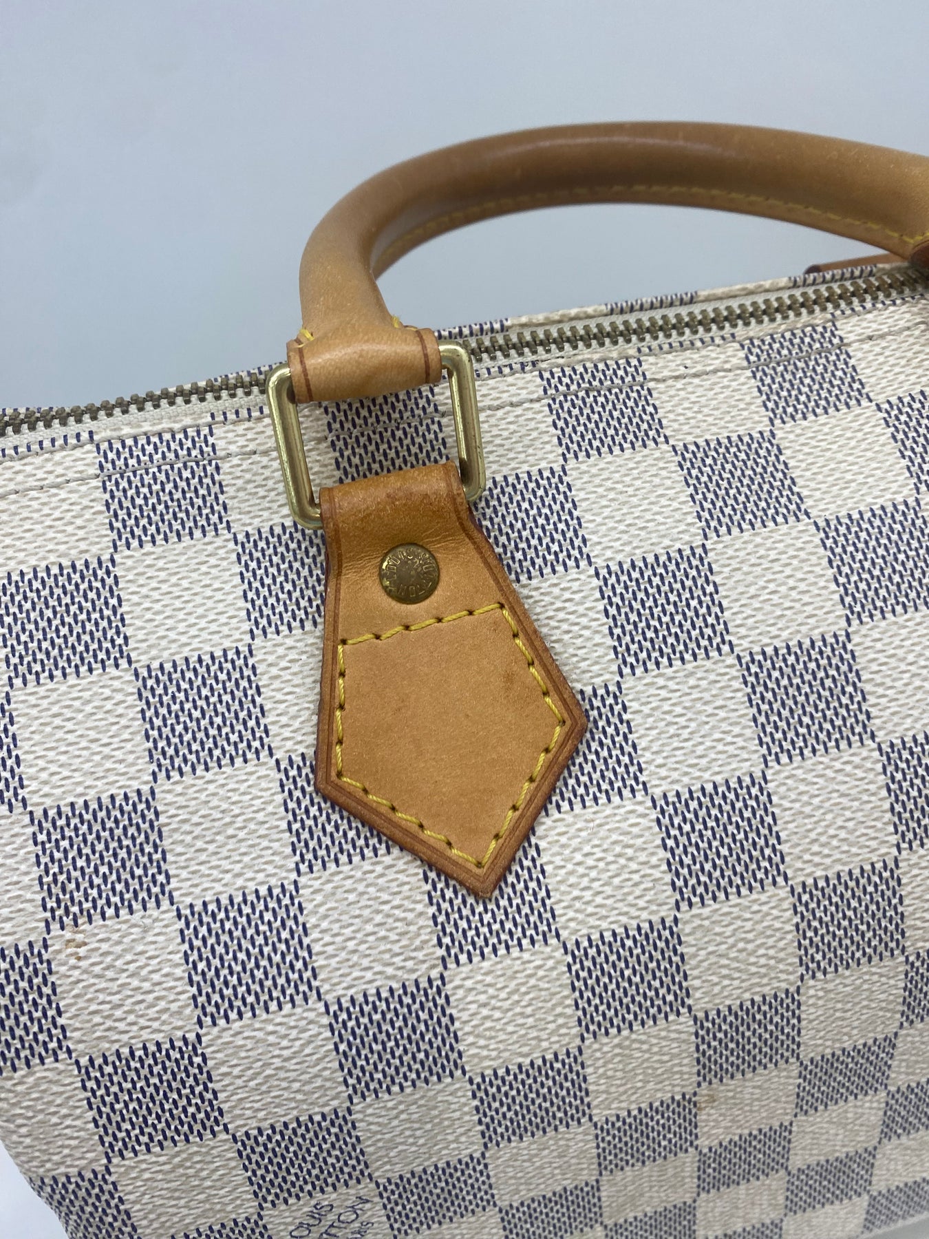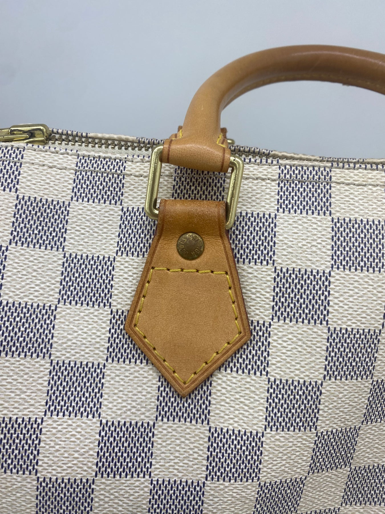 This Louis Vuitton handbag features the iconic Damier Azur canvas pattern, offering a sophisticated and timeless look. The structured shape is complemented by tan leather handles and accents that add a touch of elegance. Perfect for both casual outings and more formal events, it combines functionality with high-end style. An ideal accessory for those who appreciate luxury and craftsmanship.