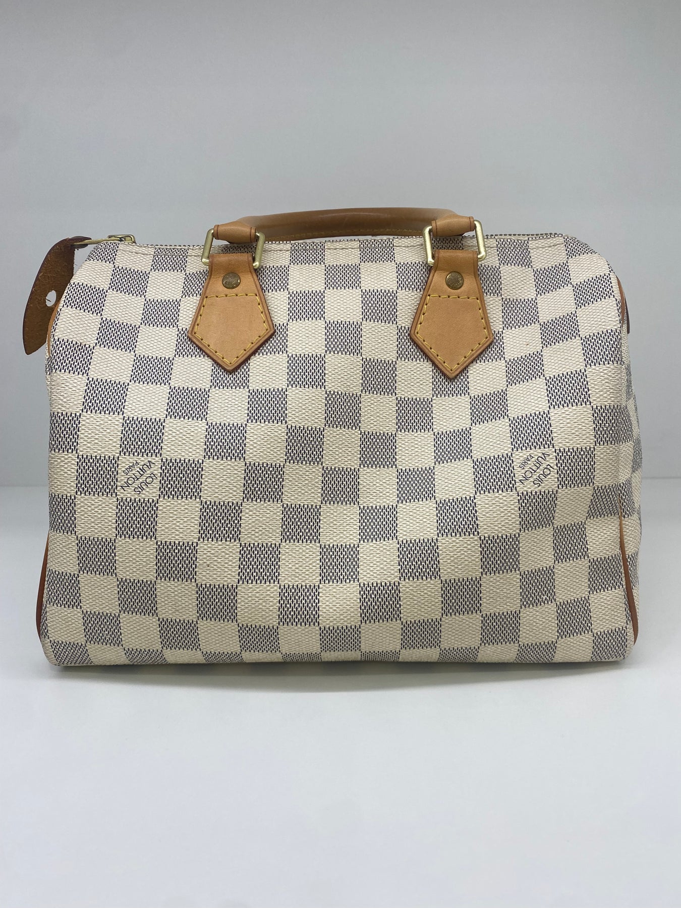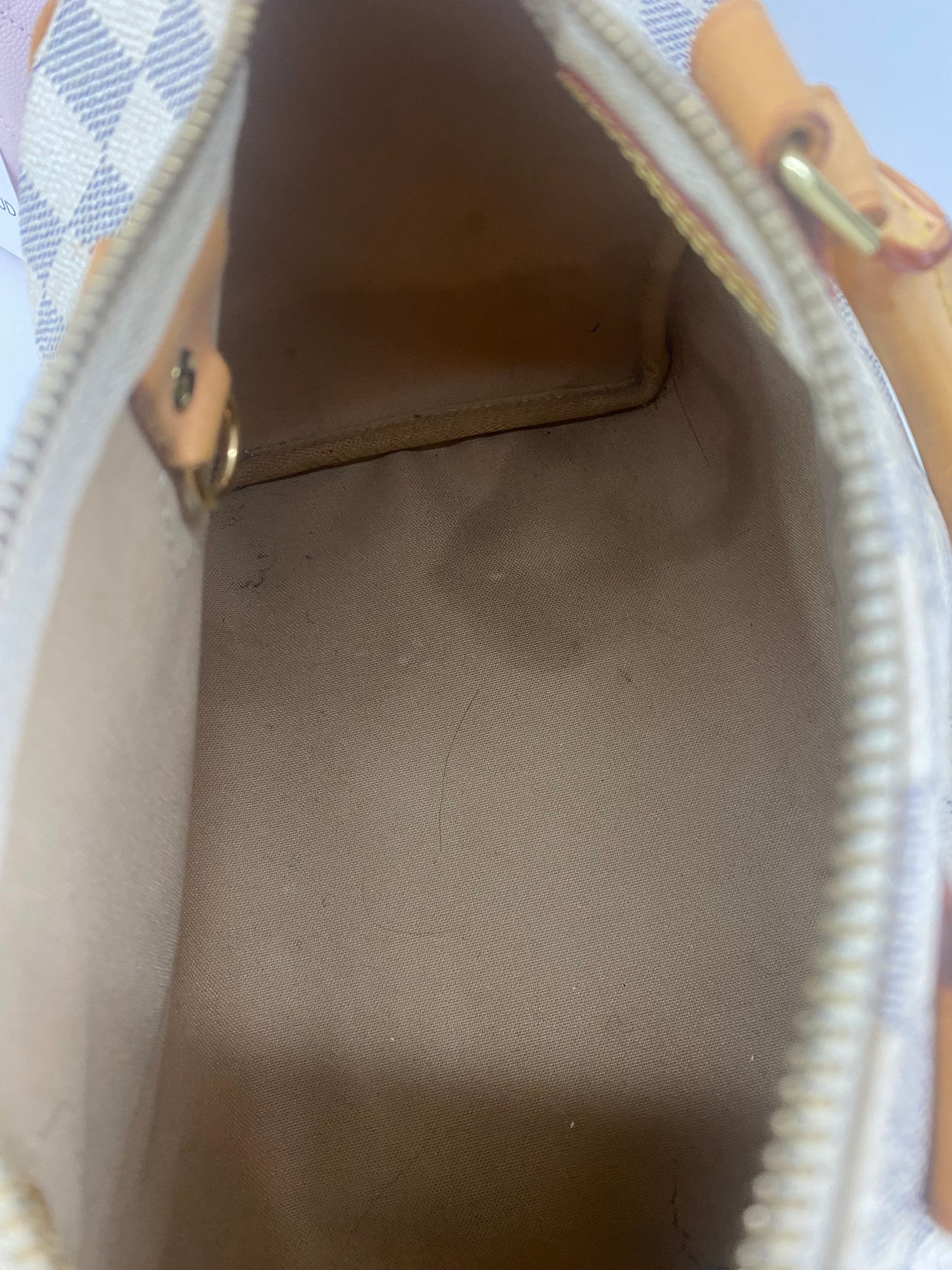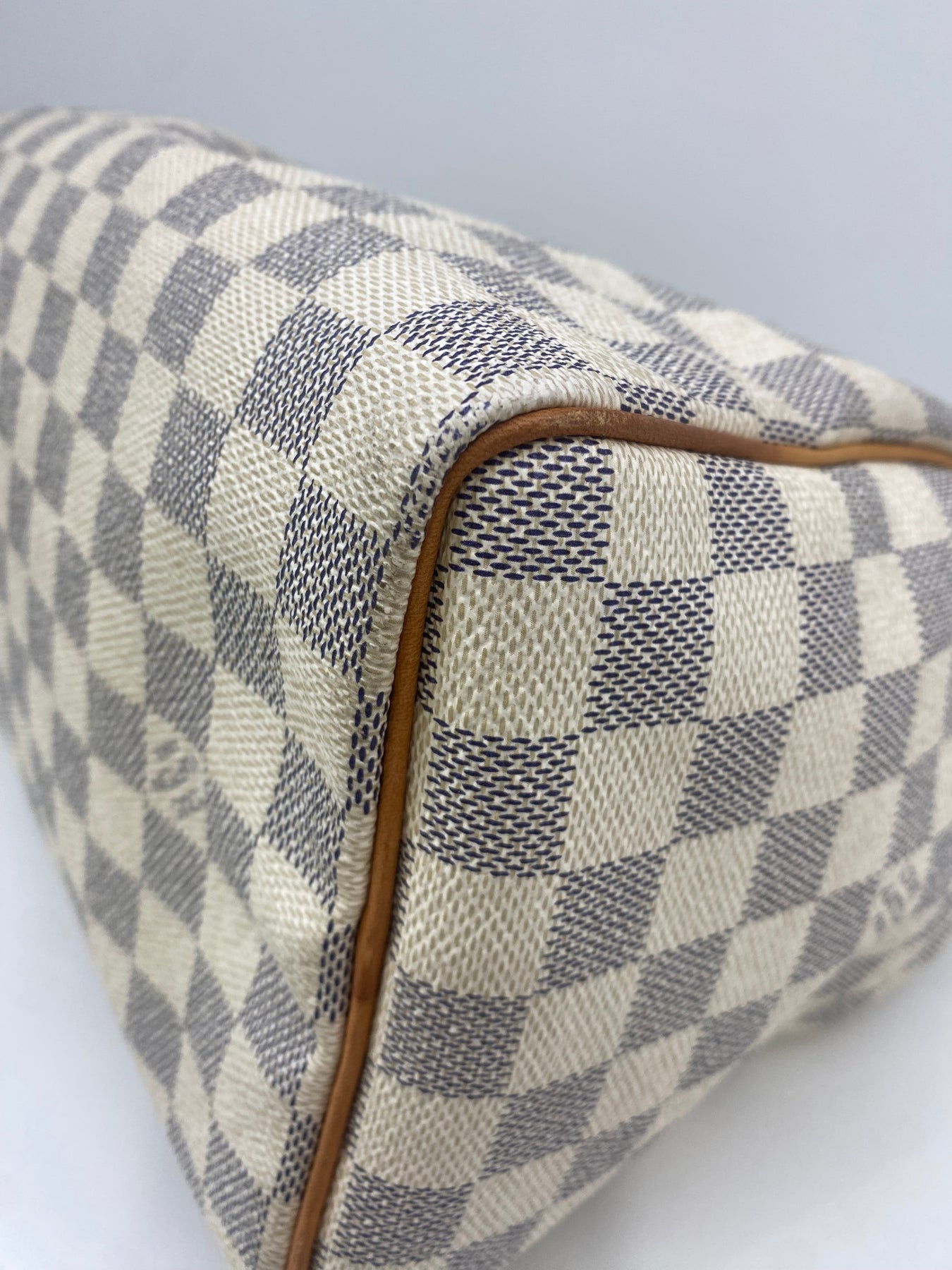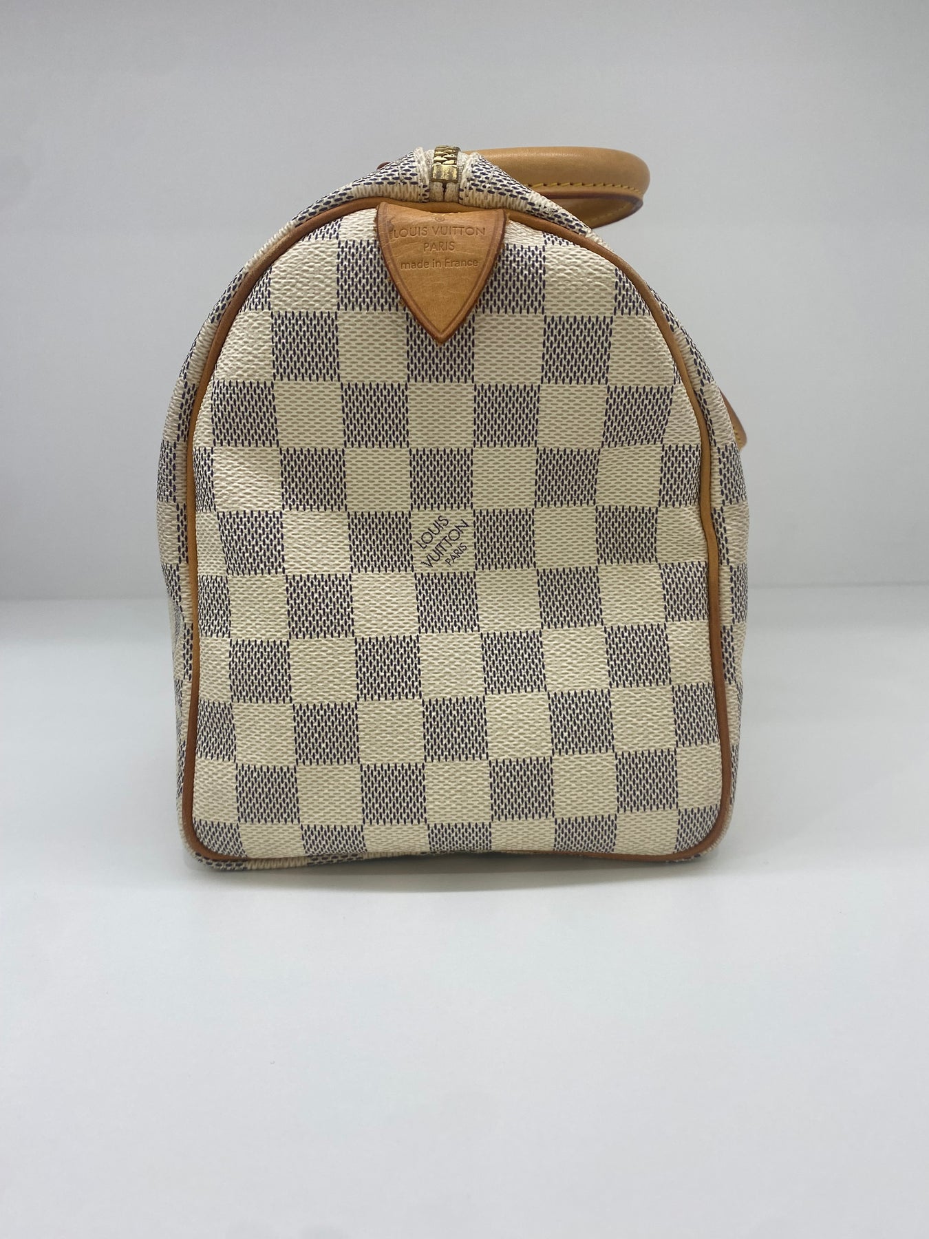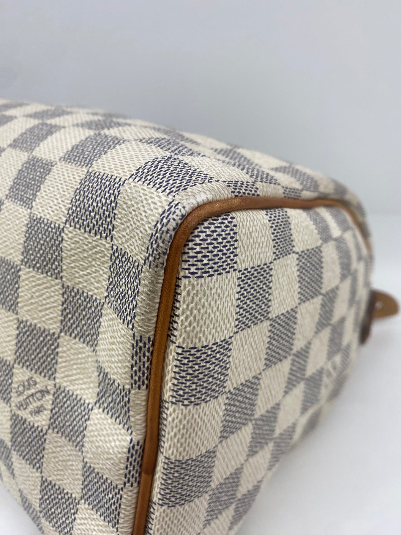 This Louis Vuitton handbag features the iconic Damier Azur canvas pattern, offering a sophisticated and timeless look. The structured shape is complemented by tan leather handles and accents that add a touch of elegance. Perfect for both casual outings and more formal events, it combines functionality with high-end style. An ideal accessory for those who appreciate luxury and craftsmanship.