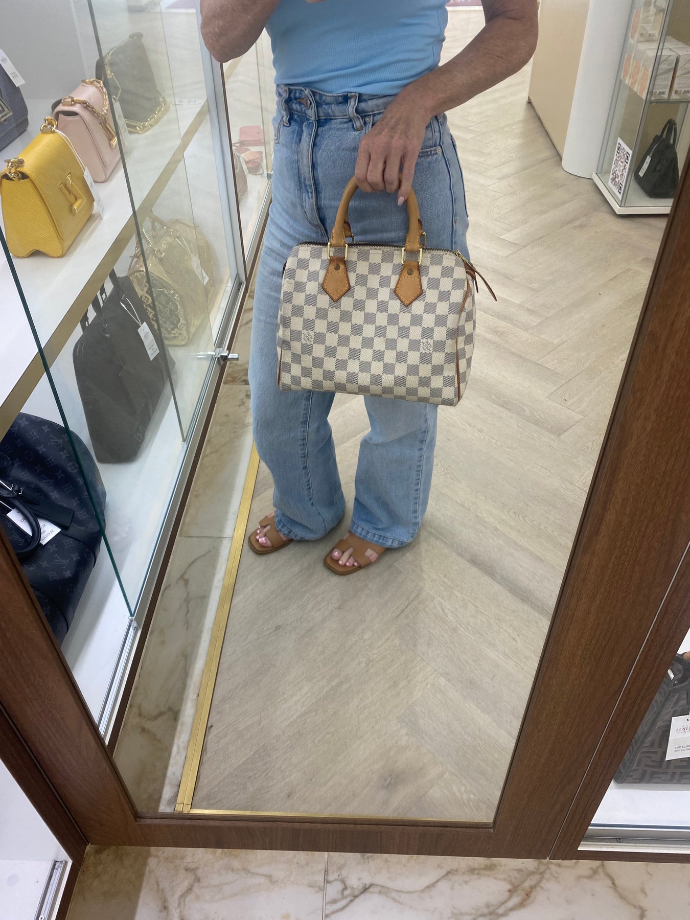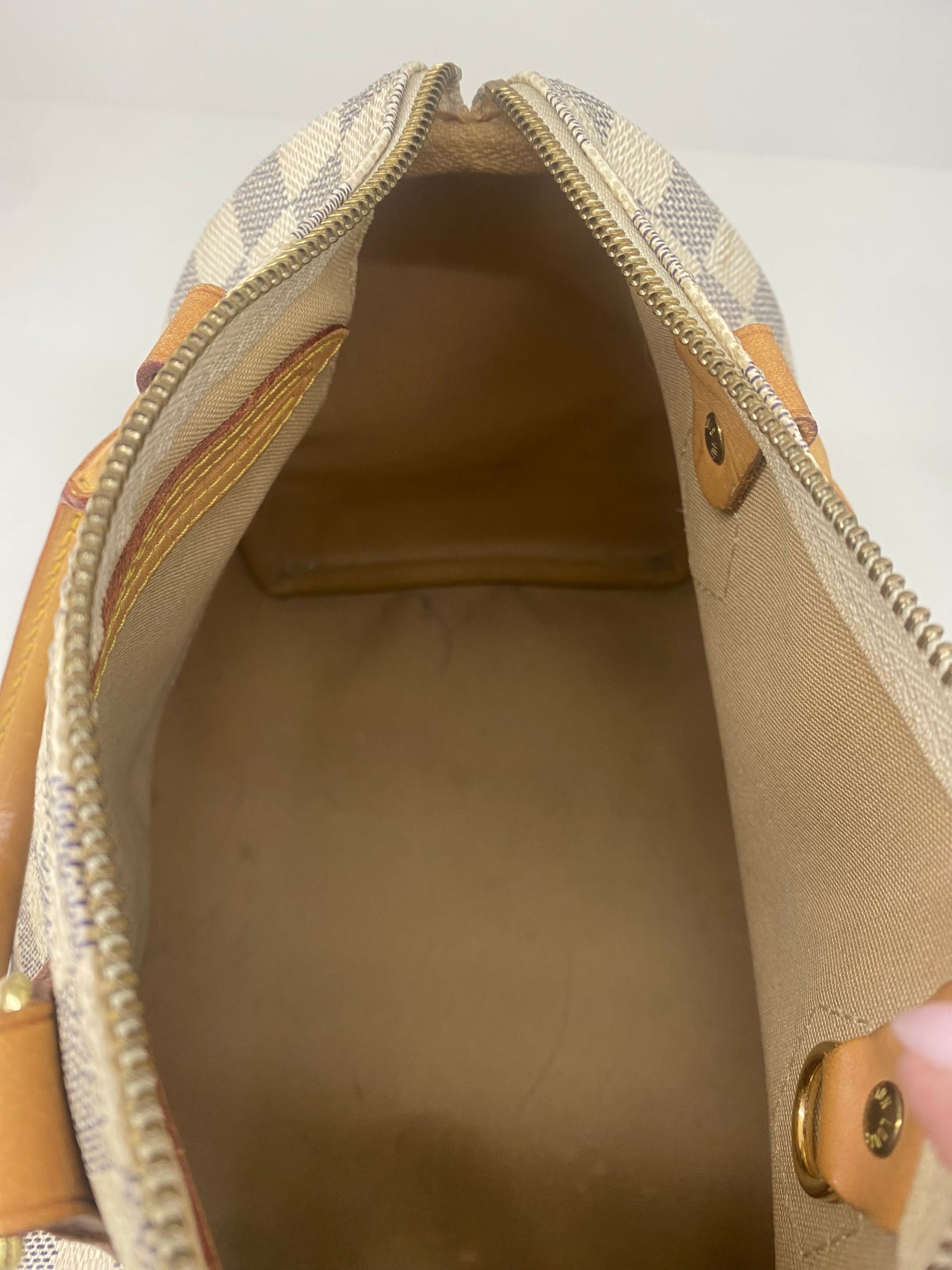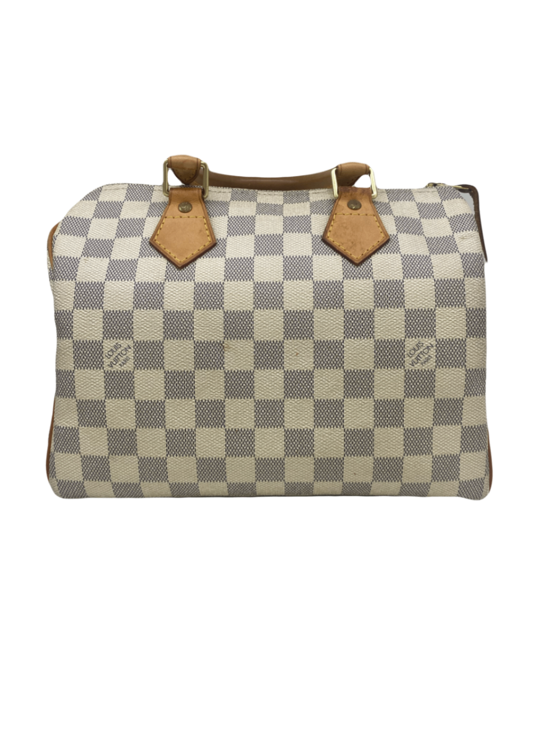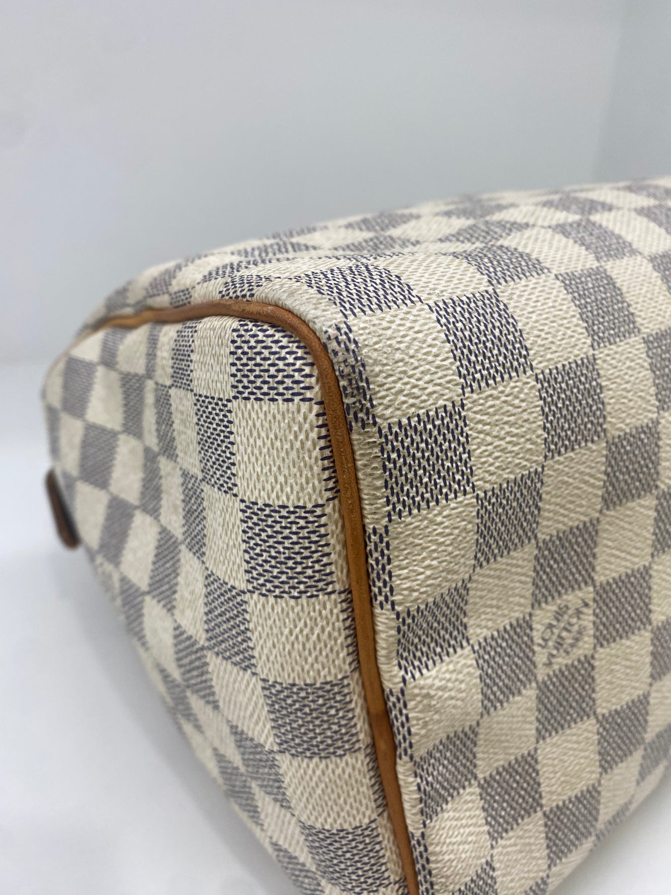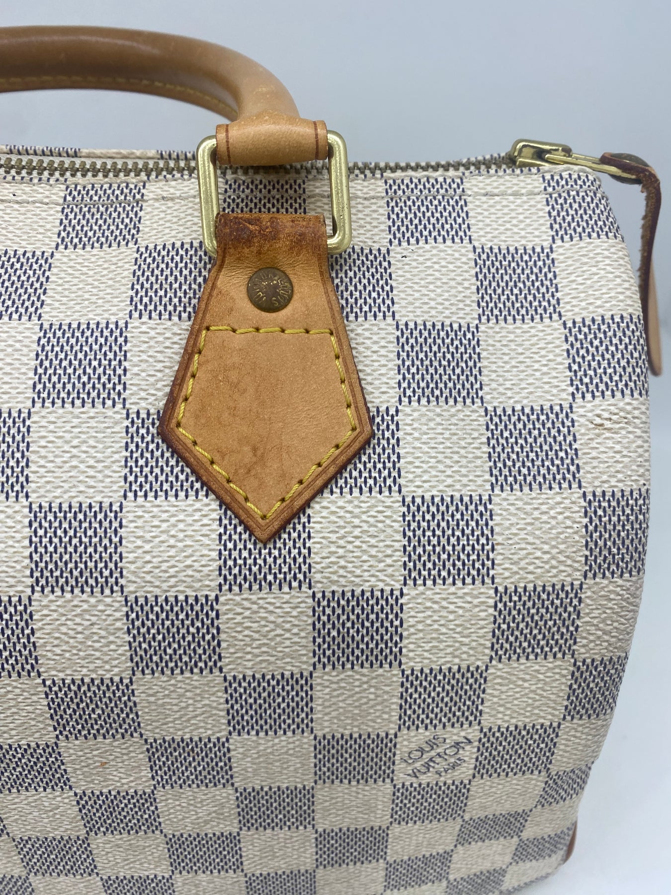 This Louis Vuitton handbag features the iconic Damier Azur canvas pattern, offering a sophisticated and timeless look. The structured shape is complemented by tan leather handles and accents that add a touch of elegance. Perfect for both casual outings and more formal events, it combines functionality with high-end style. An ideal accessory for those who appreciate luxury and craftsmanship.