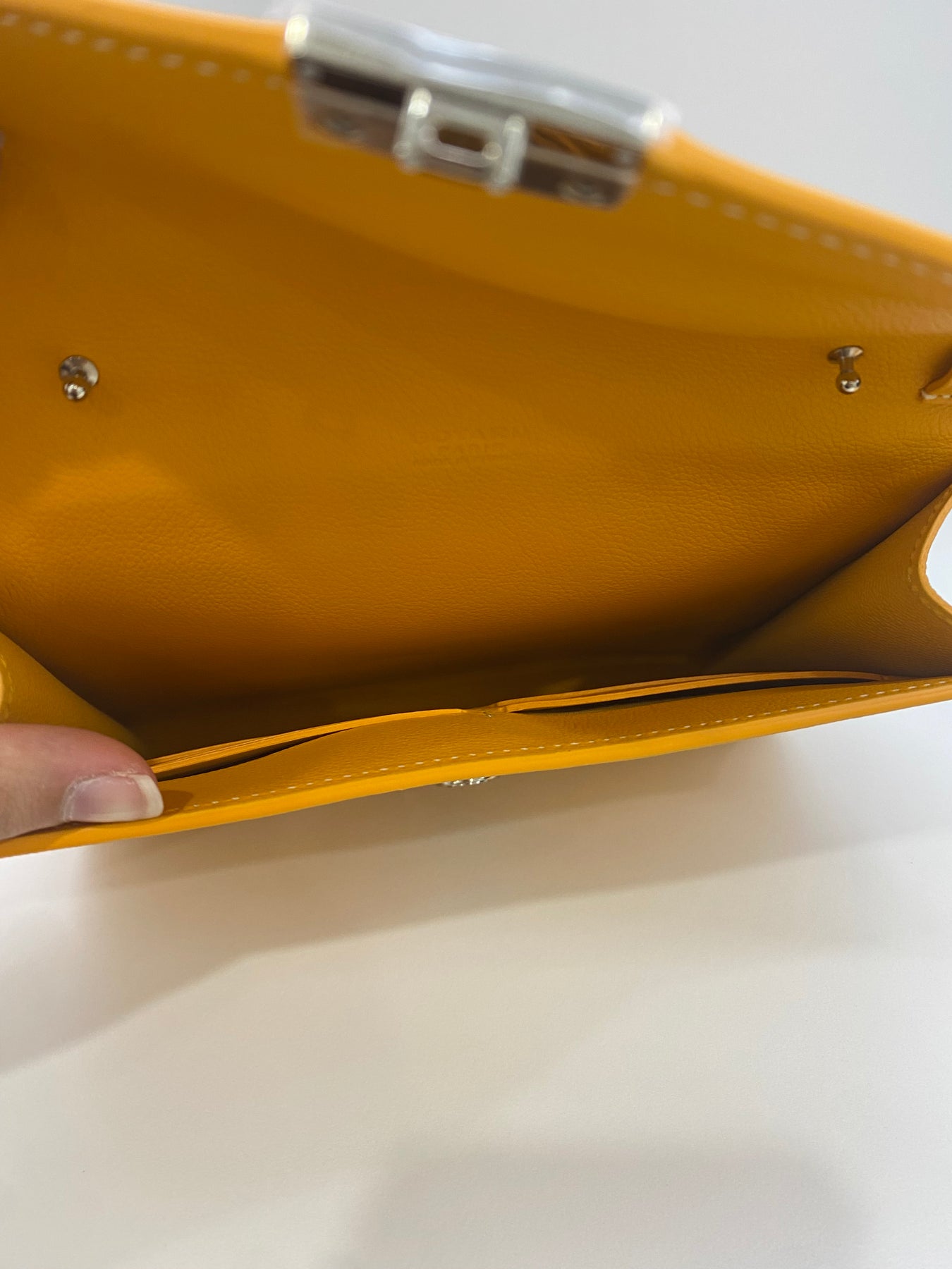 Brand new. Protective plastic remains on the hardware lock. The exterior is pristine with no visible marks. Inside, there is a very small almost not visible pressure mark in the leather, but overall the bag presents as new.