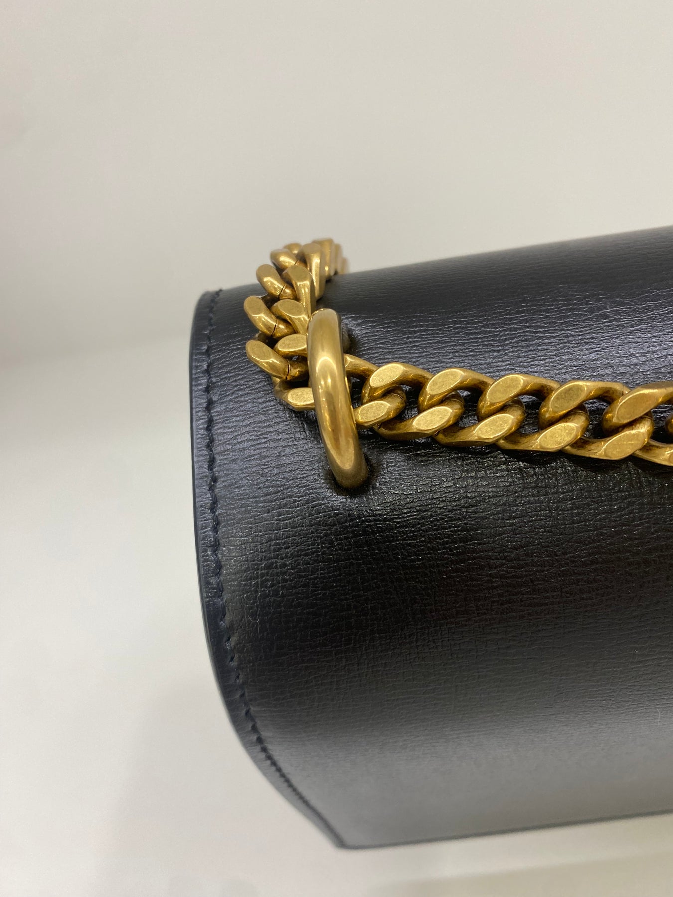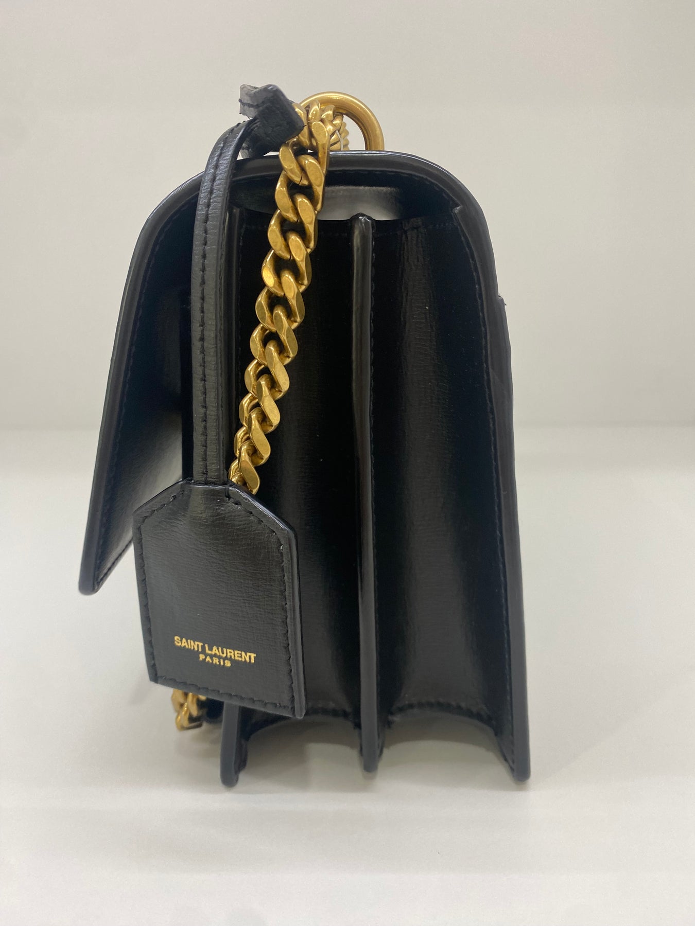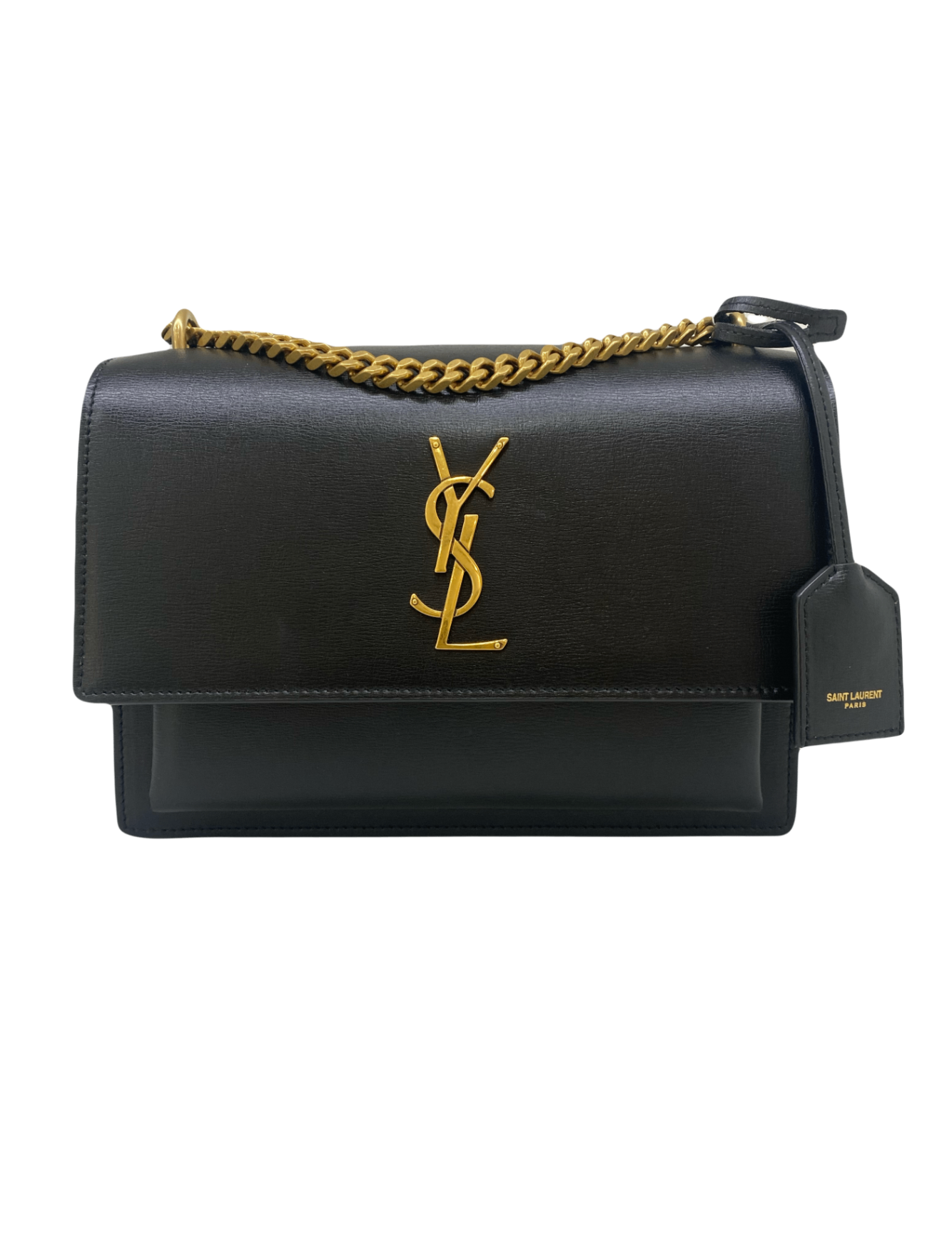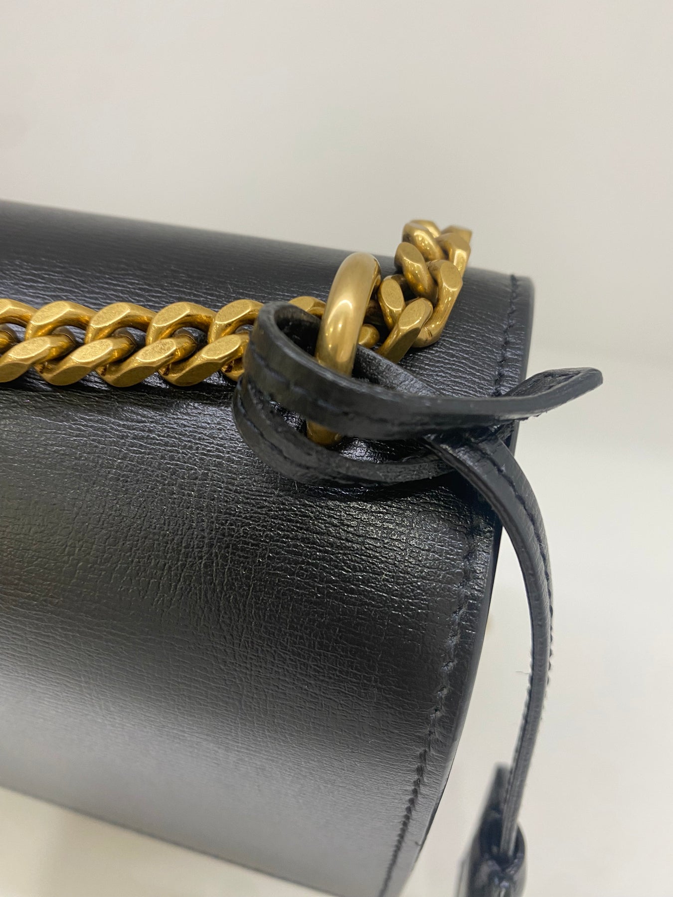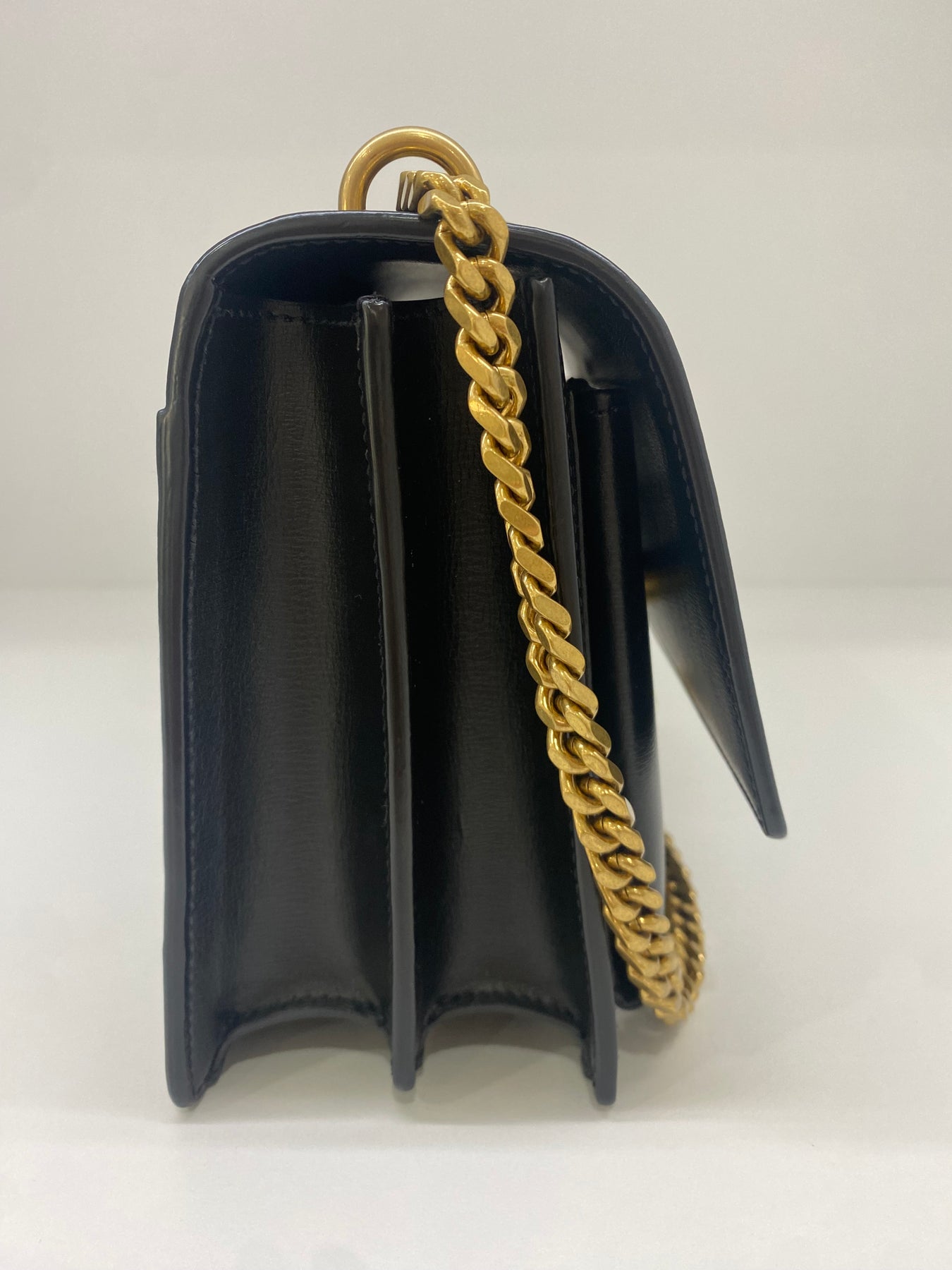 This Saint Laurent shoulder bag exudes timeless sophistication with its sleek black leather design. The standout feature is the iconic YSL logo in gold-tone hardware, adding a touch of luxury. The chain strap enhances its elegant appeal, making it perfect for both day and evening wear. Compact yet stylish, this bag is a versatile accessory for fashion-forward individuals.