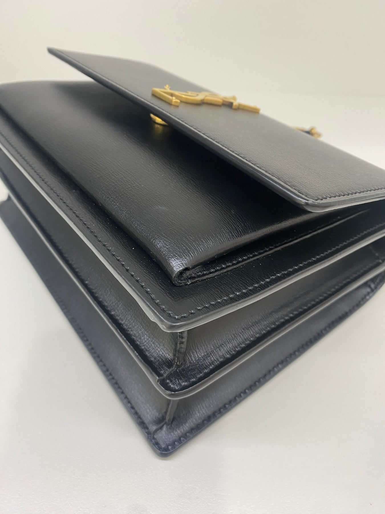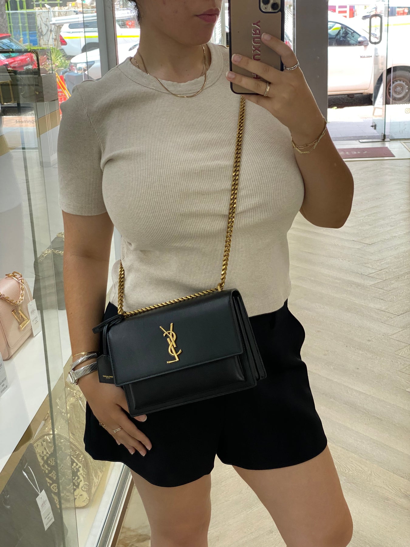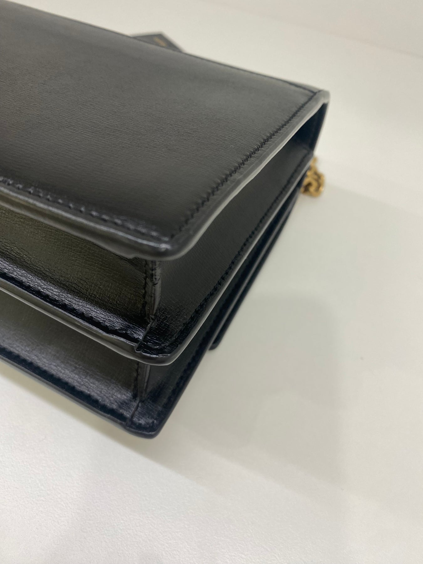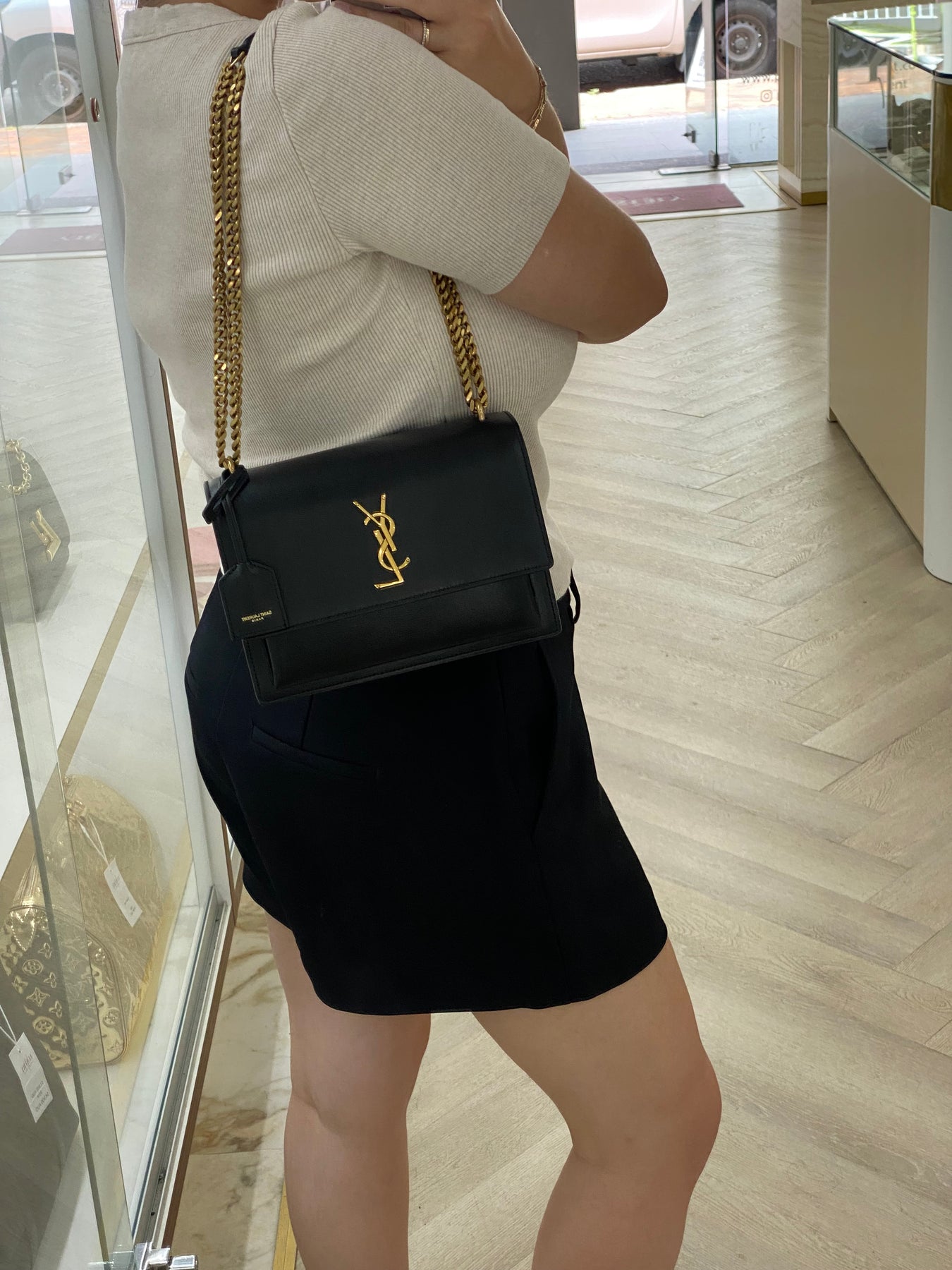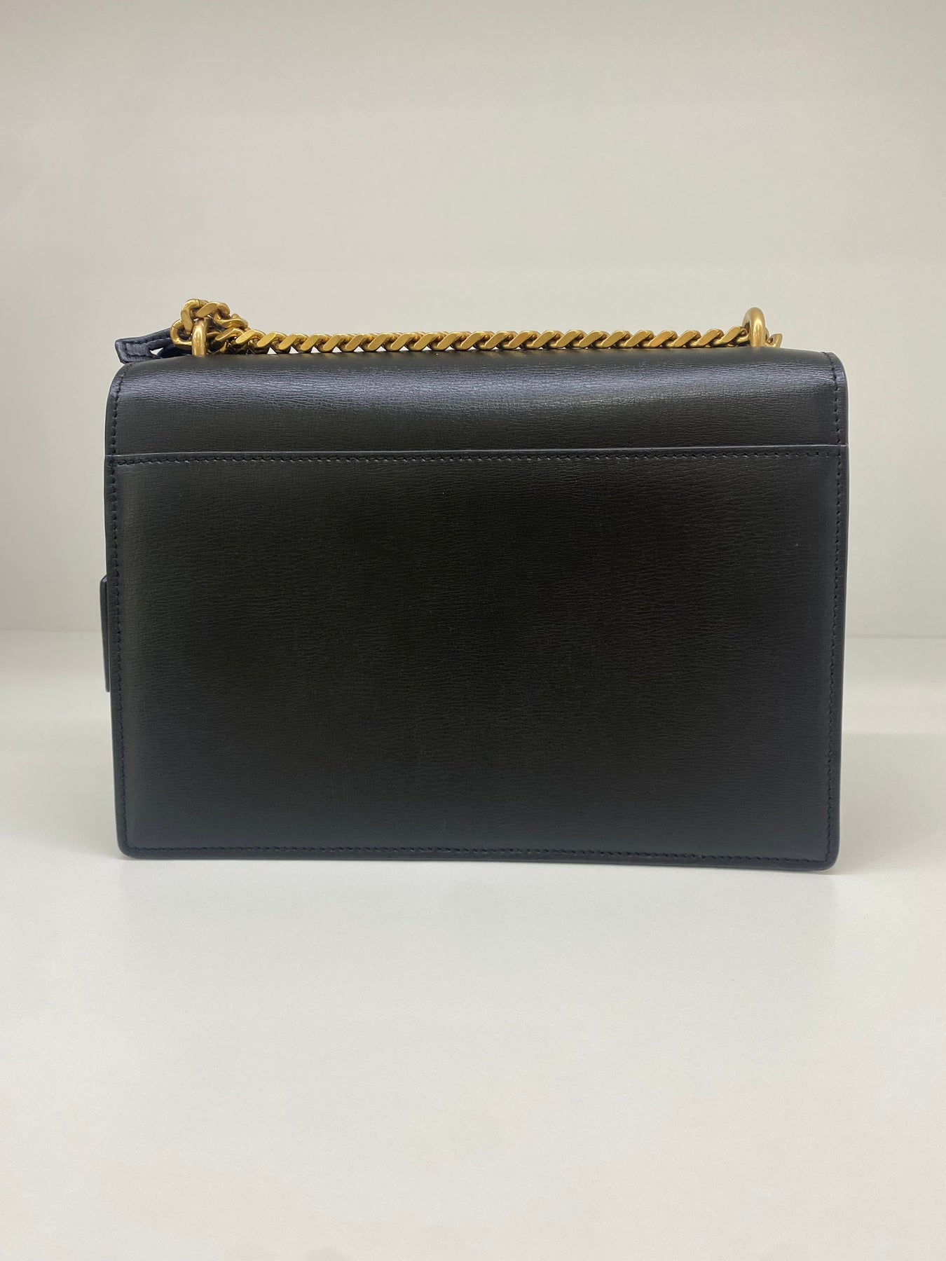 This Saint Laurent shoulder bag exudes timeless sophistication with its sleek black leather design. The standout feature is the iconic YSL logo in gold-tone hardware, adding a touch of luxury. The chain strap enhances its elegant appeal, making it perfect for both day and evening wear. Compact yet stylish, this bag is a versatile accessory for fashion-forward individuals.