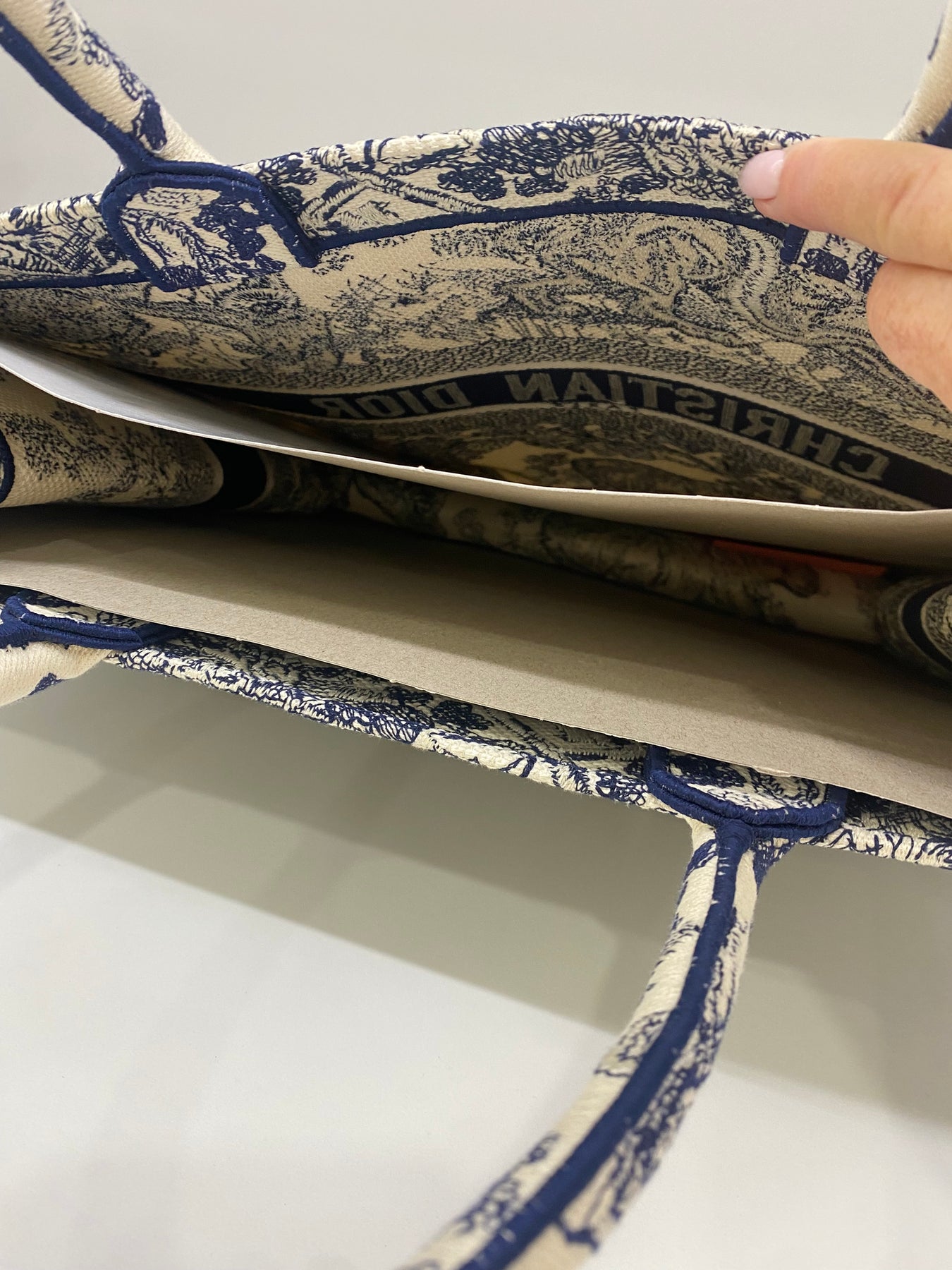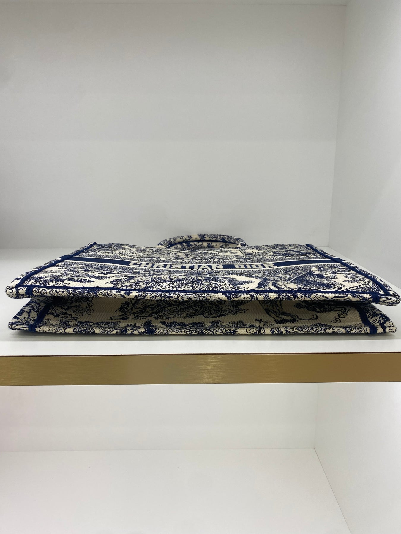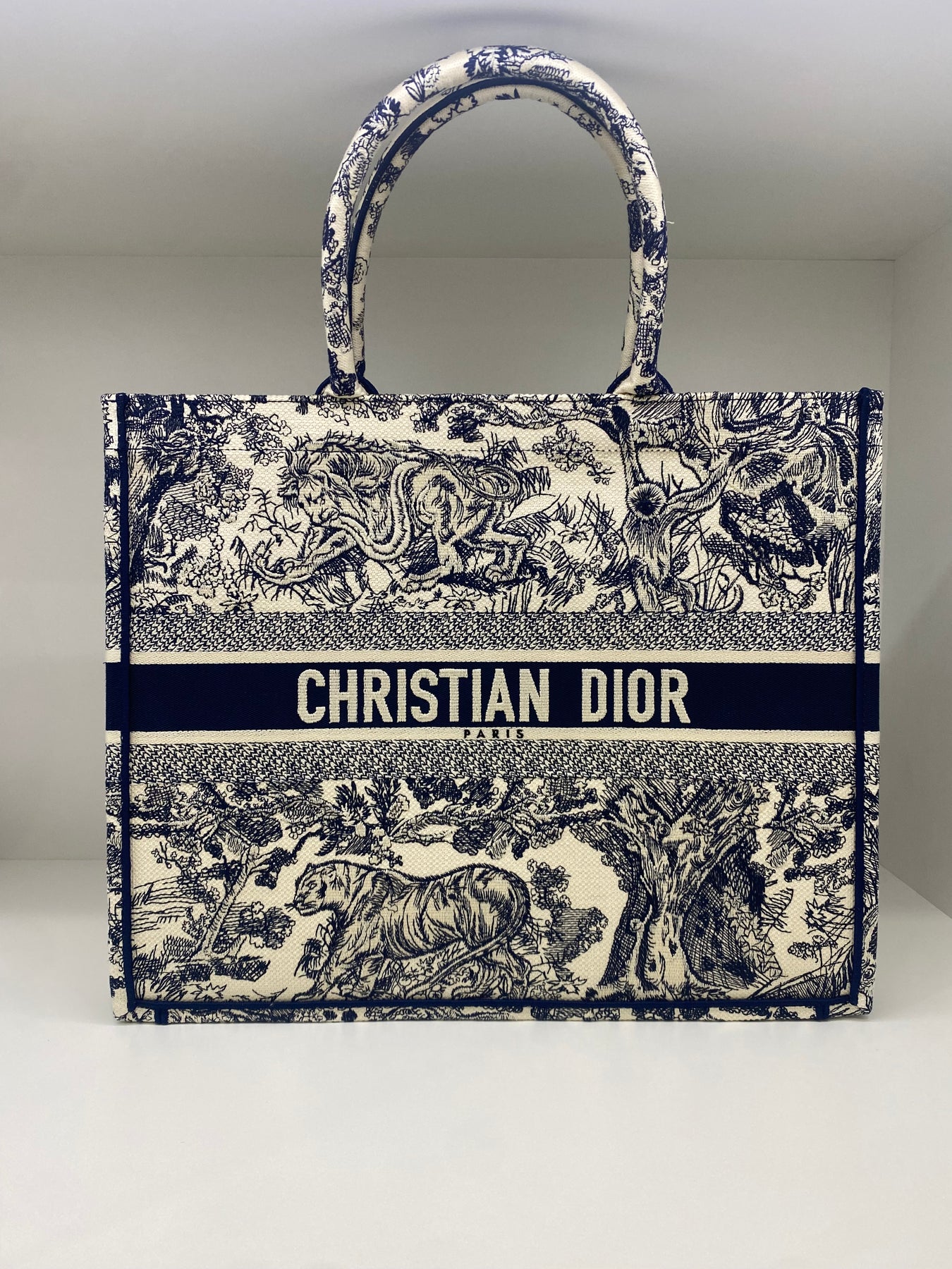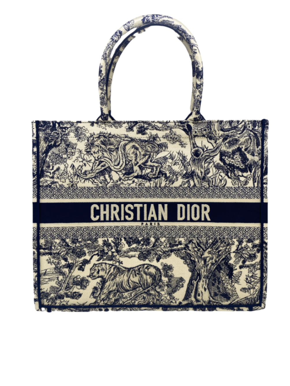 This Christian Dior tote bag features an intricate toile de Jouy print showcasing wildlife and nature scenes. Crafted from high-quality fabric, it combines luxury with practicality. The bold logo band adds a modern touch to the classic design. Ideal for elevating everyday looks with a statement piece.